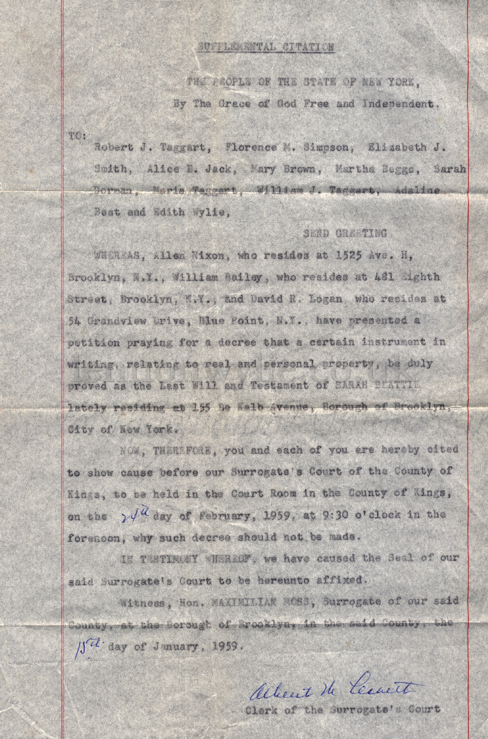 Will and Testament of Sarah Beattie, lately residing at 155 De Kalb Avenue,