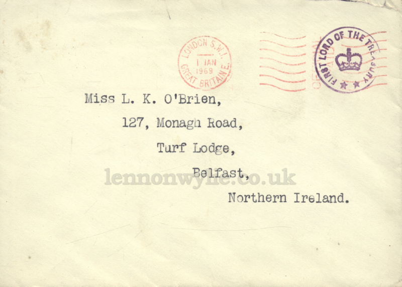 1) 1st January 1969 Postmark London/First Lord of the Treasury to Miss L. K.