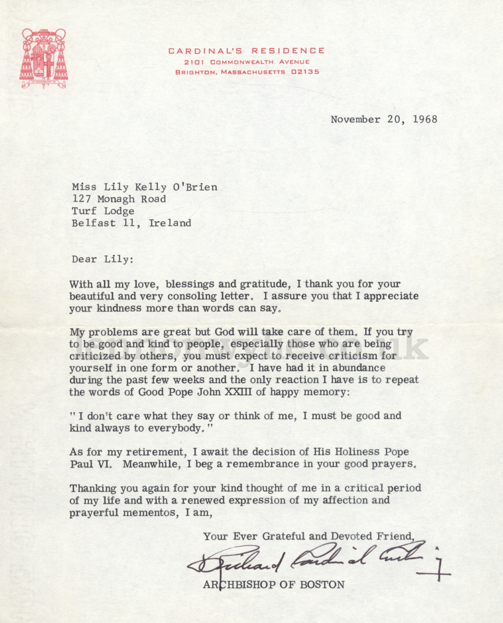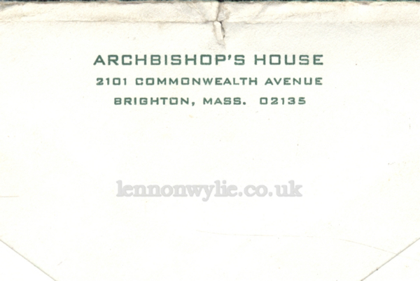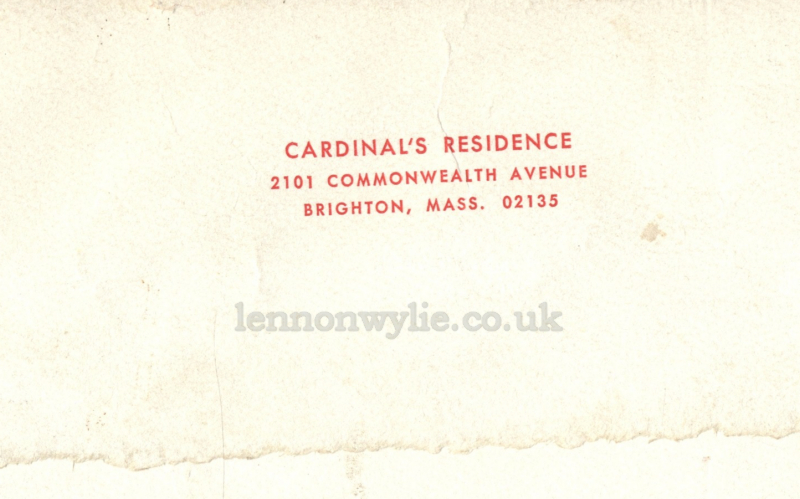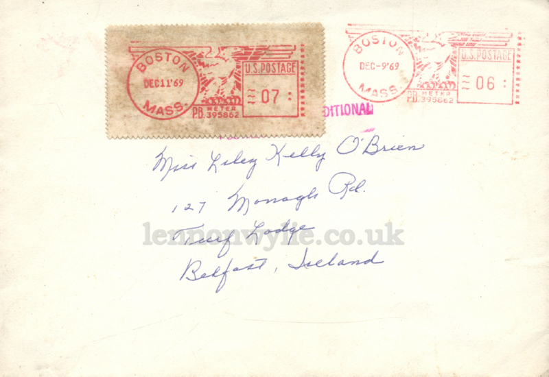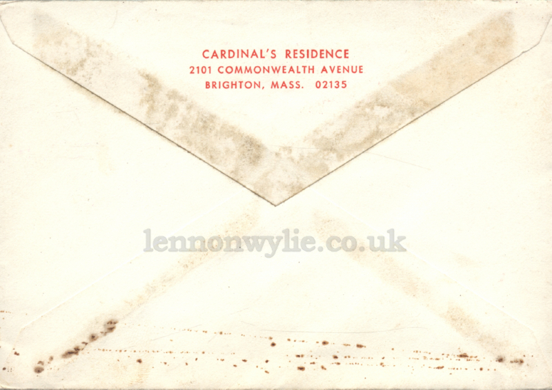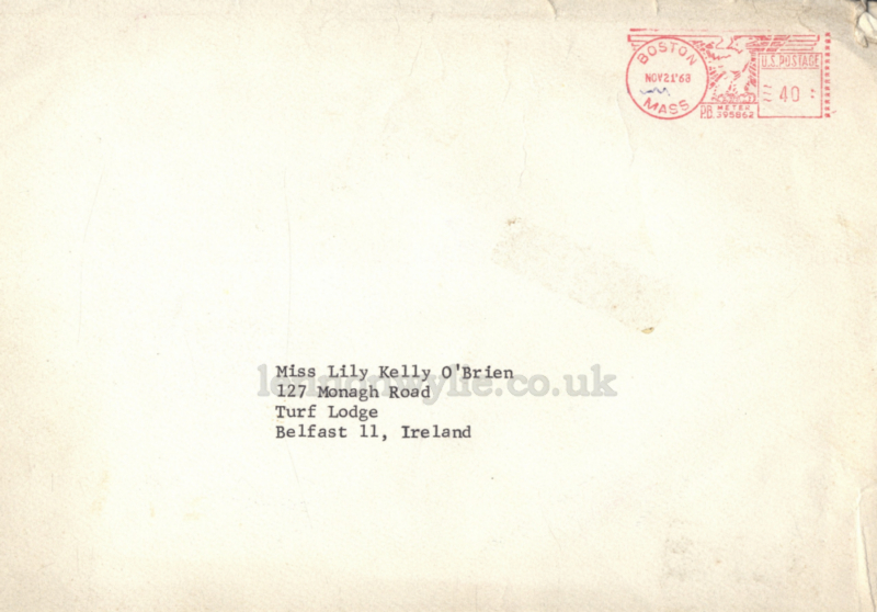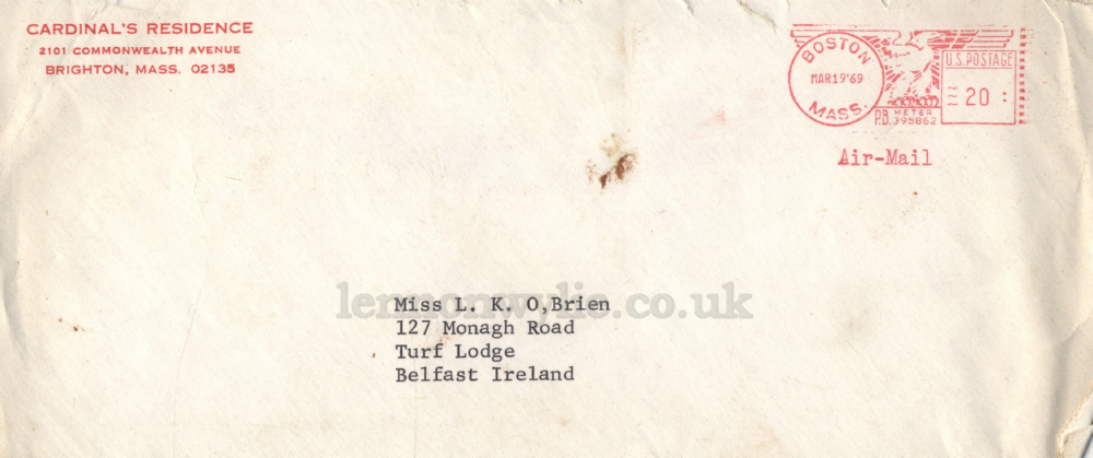 2) 21st November 1968 Postmark Boston, Mass. to Miss Lily Kelly O'Brien, 127 Monagh Road, Turf Lodge, Belfast 11, Ireland - Cardinal's Residence, 2101