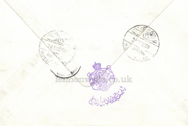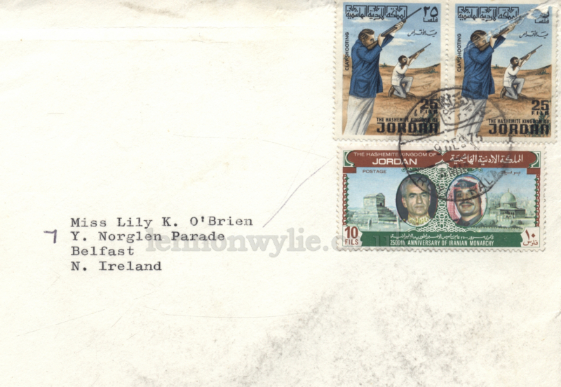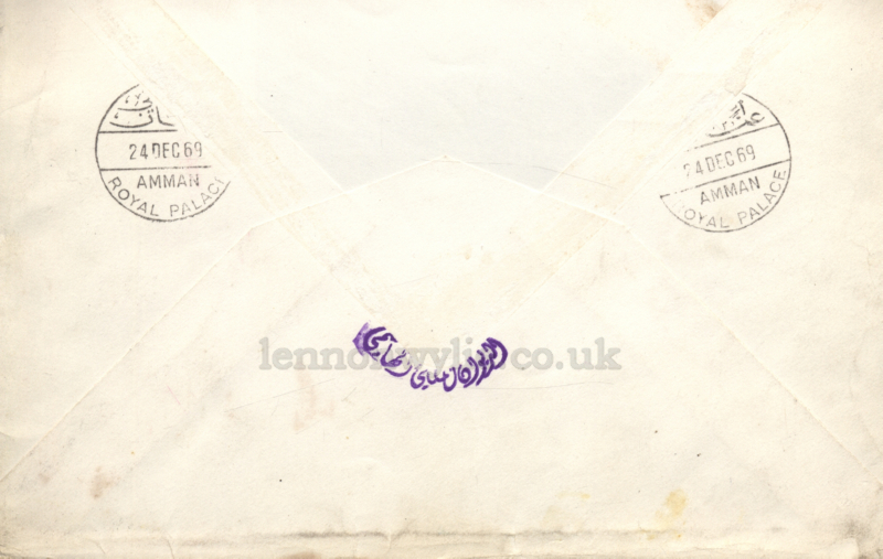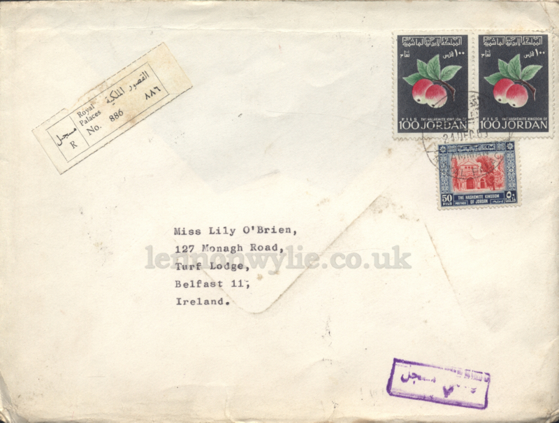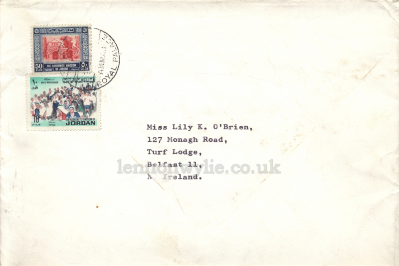 1) 24th December 1969 Postmark Amman Royal Palace to Miss Lily O'Brien, 127 Monagh Road, Turf Lodge, Belfast 11, Ireland - My parents and I send you our