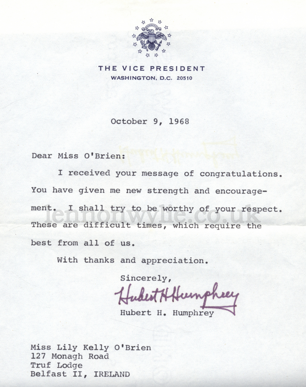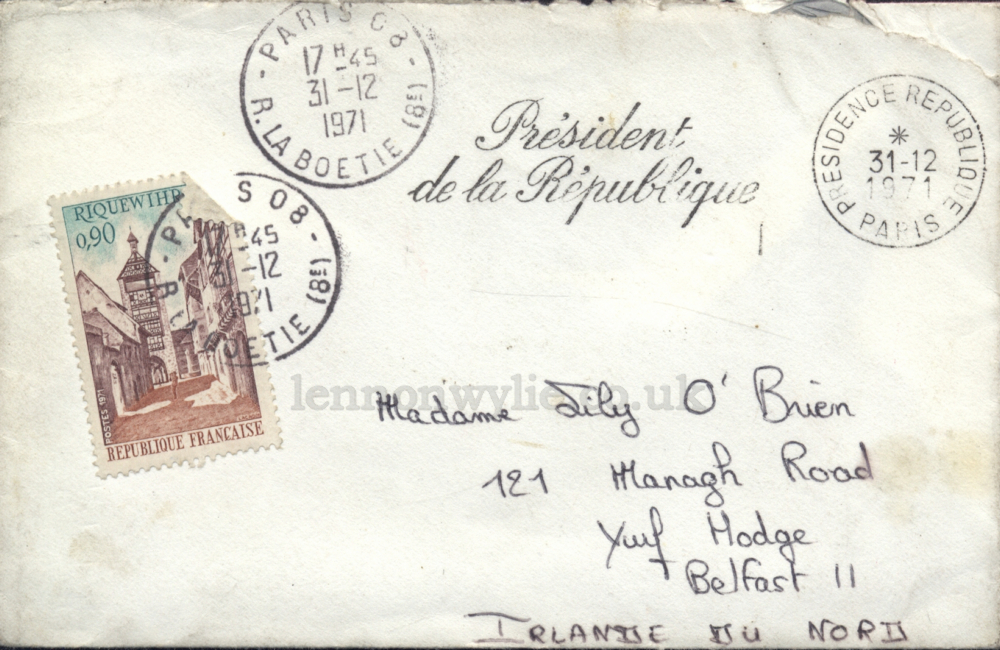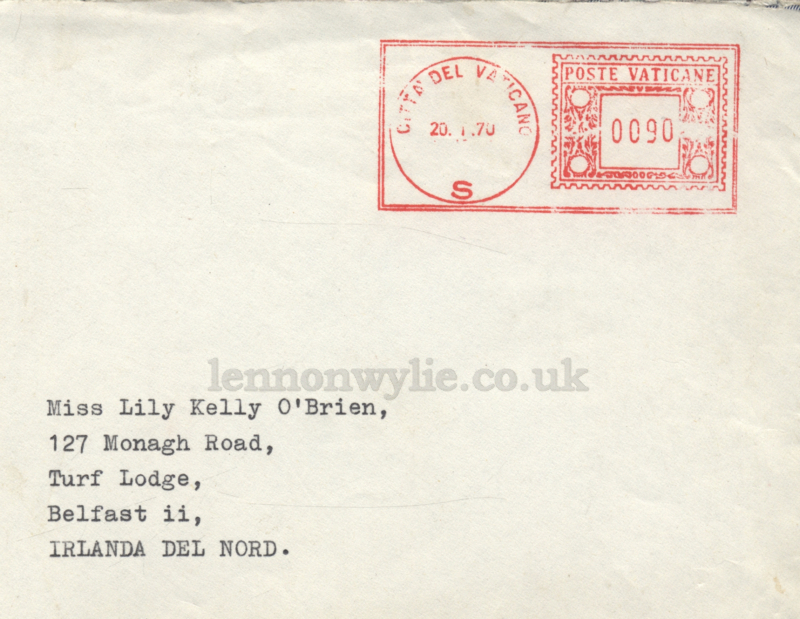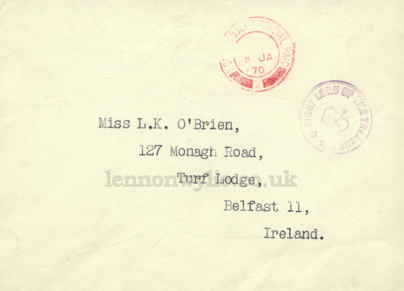 2) 24th February 1972 to Miss Lily O'Brien, 127 Monagh Road, Turf Lodge,