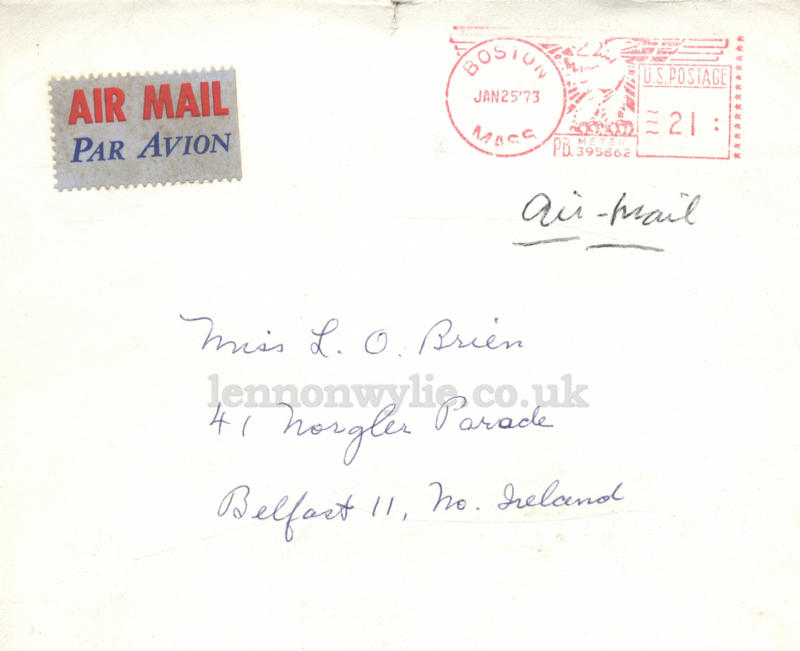 3) 27th November 1974 Postmark Boston, Mass. to Miss L. O. Brien, 41 Norglen