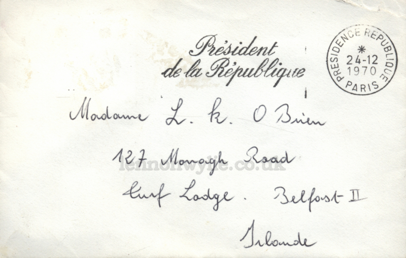 1) 24th December 1968 Postmark Royal Palace to Miss Lily O'Brien, 127 Monagh