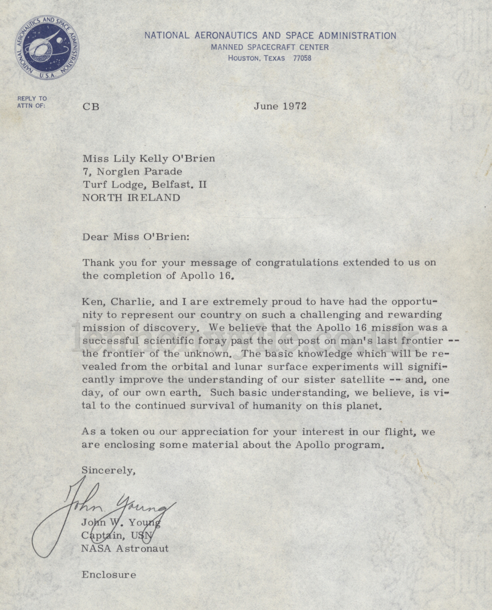 program. Sincerely, John (W,) Young, Captain, USN NASA Astronaut