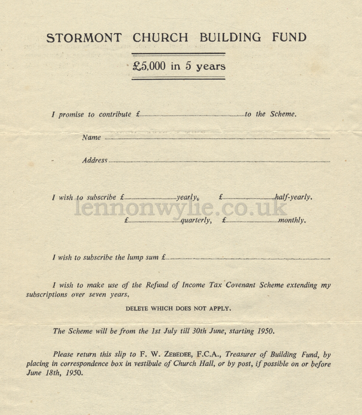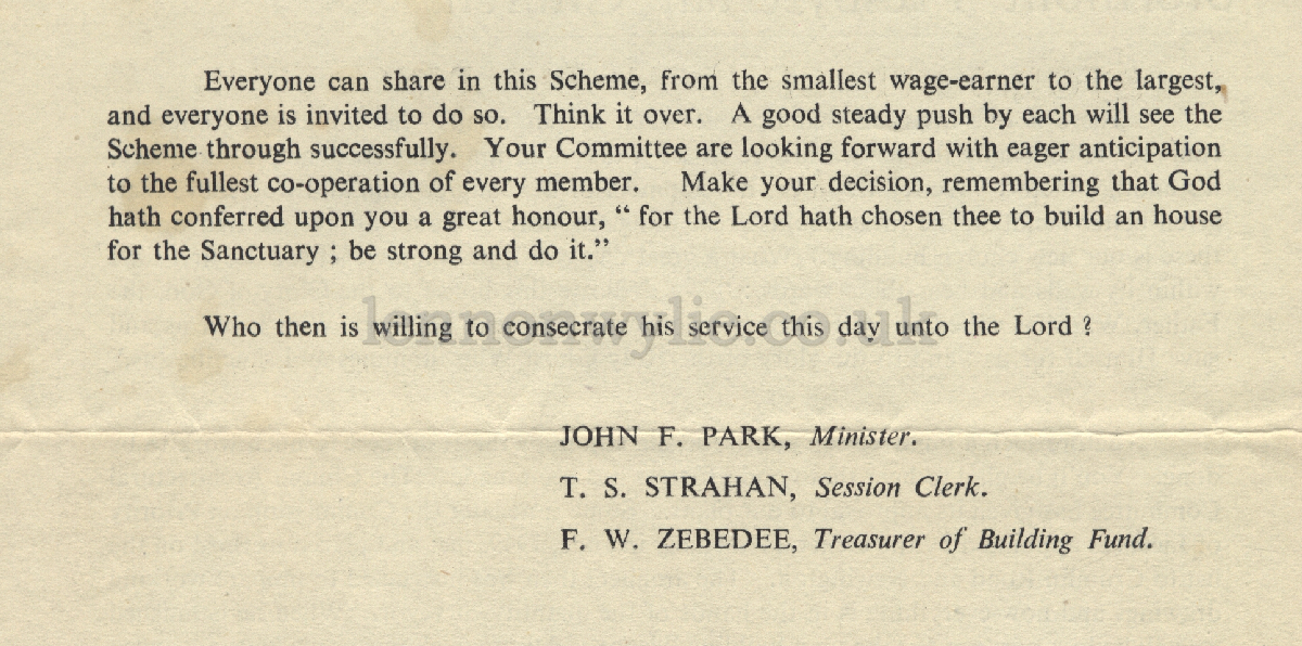 T. S. Strahan, Session Clerk; F. W. Zebedee, Treasurer of Building Fund.