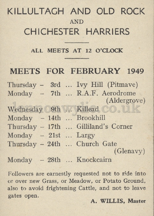 Corner, Largy, Church Gate (Glenavy), Knockcairn. A. Willis, Master