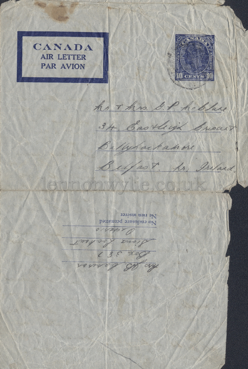 2) 23rd January 1950 from Canada to Mr. & Mrs. G. P. McClune, 34 Eastleigh