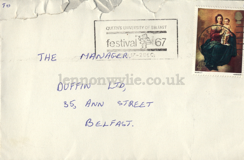 Festival 67 to Ian McClune Esq., 35 Kensington Gardens, Belfast