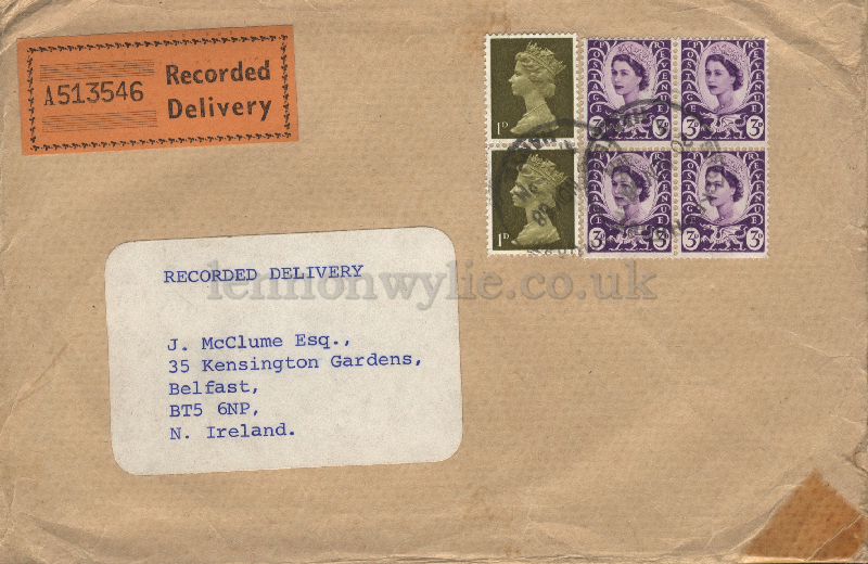 4) 20th November 1968 Postmark Brook? Recorded Delivery to J. McClune Esq.,