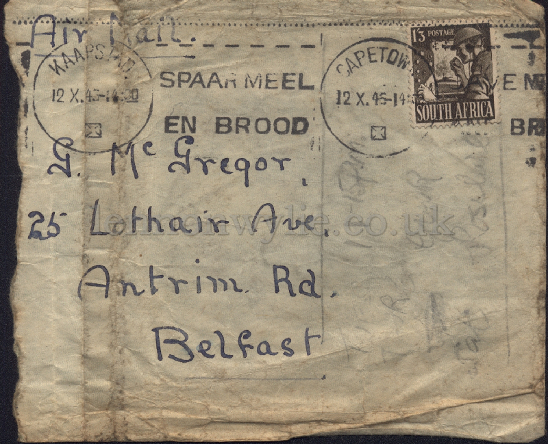 4) 12th October 1945 Postmarks Kaapstad/Capetown to G. McGregor, 25 Lothair
