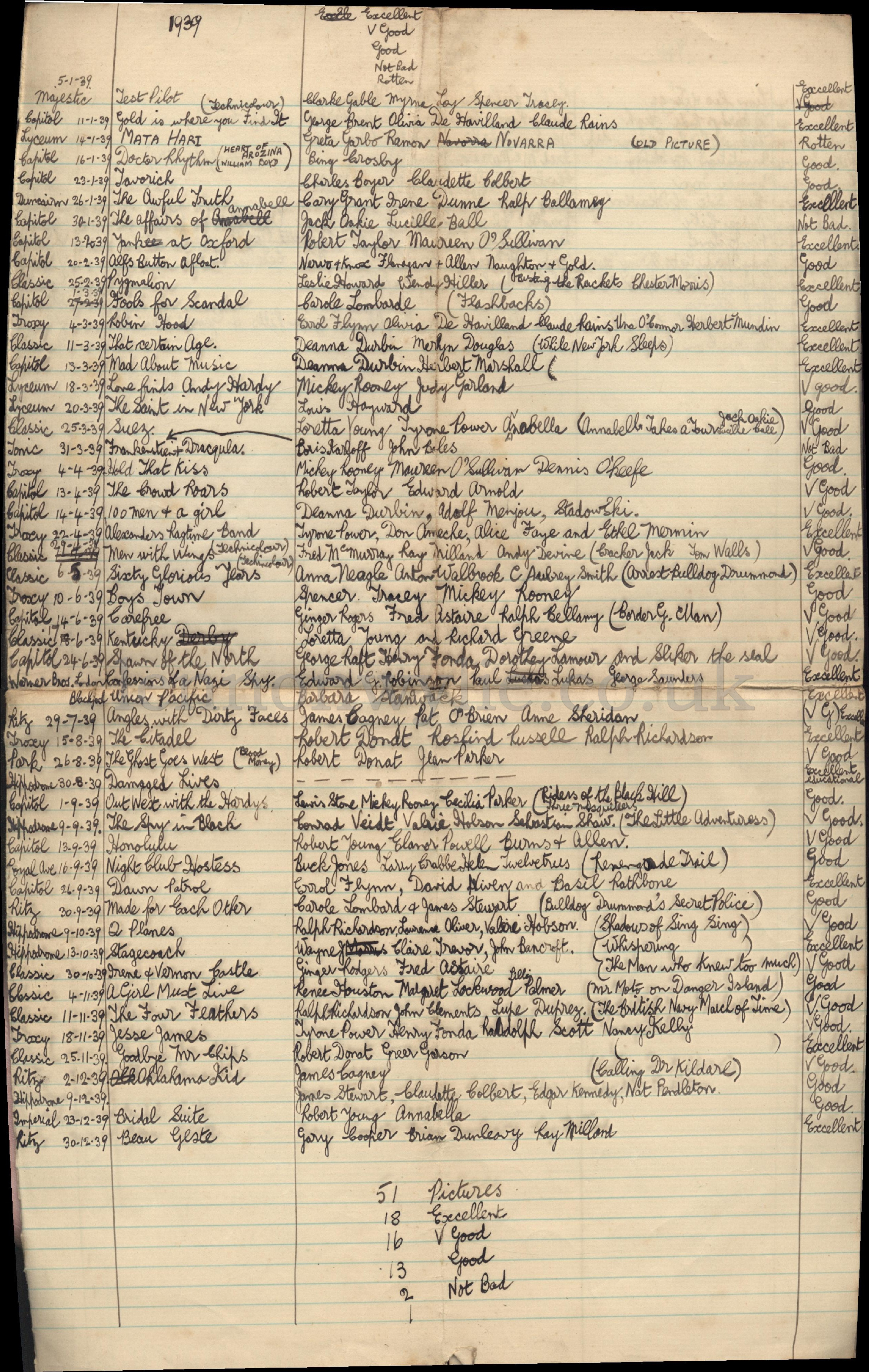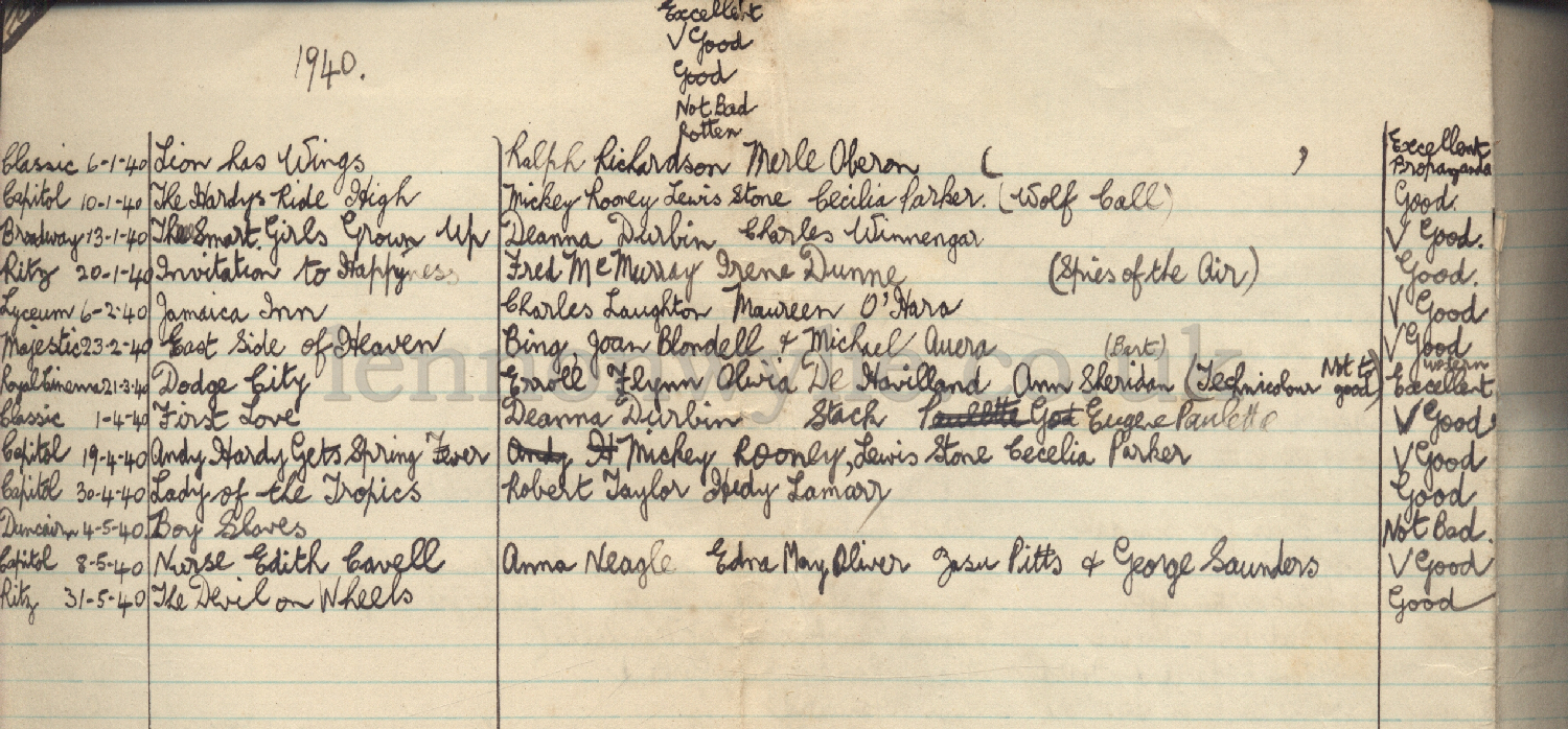 watched - list of movies with actors and date and where shown