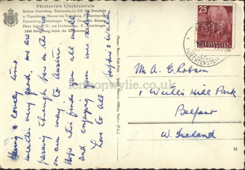 1) 14th July 1953 Postmark Vaduz, Liechtenstein to Mr. A. E. Robson, 1