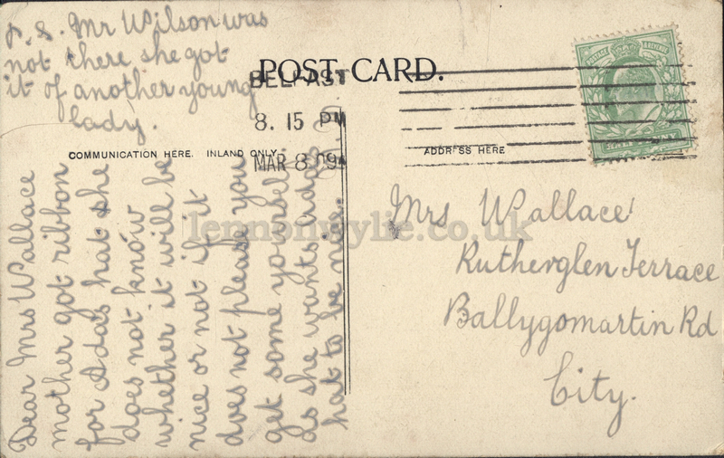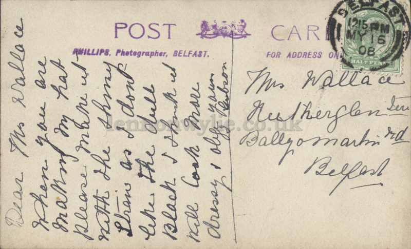 1) 16th May 1908 Postmark Belfast to Mrs. Wallace, Rutherglen Terrace?,
