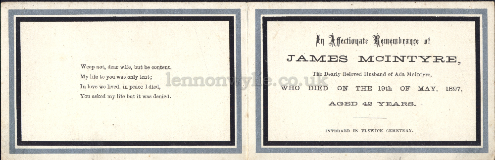 Beloved Husband of Ada McIntyre, who died on the 19th of May, 1897, aged 42
