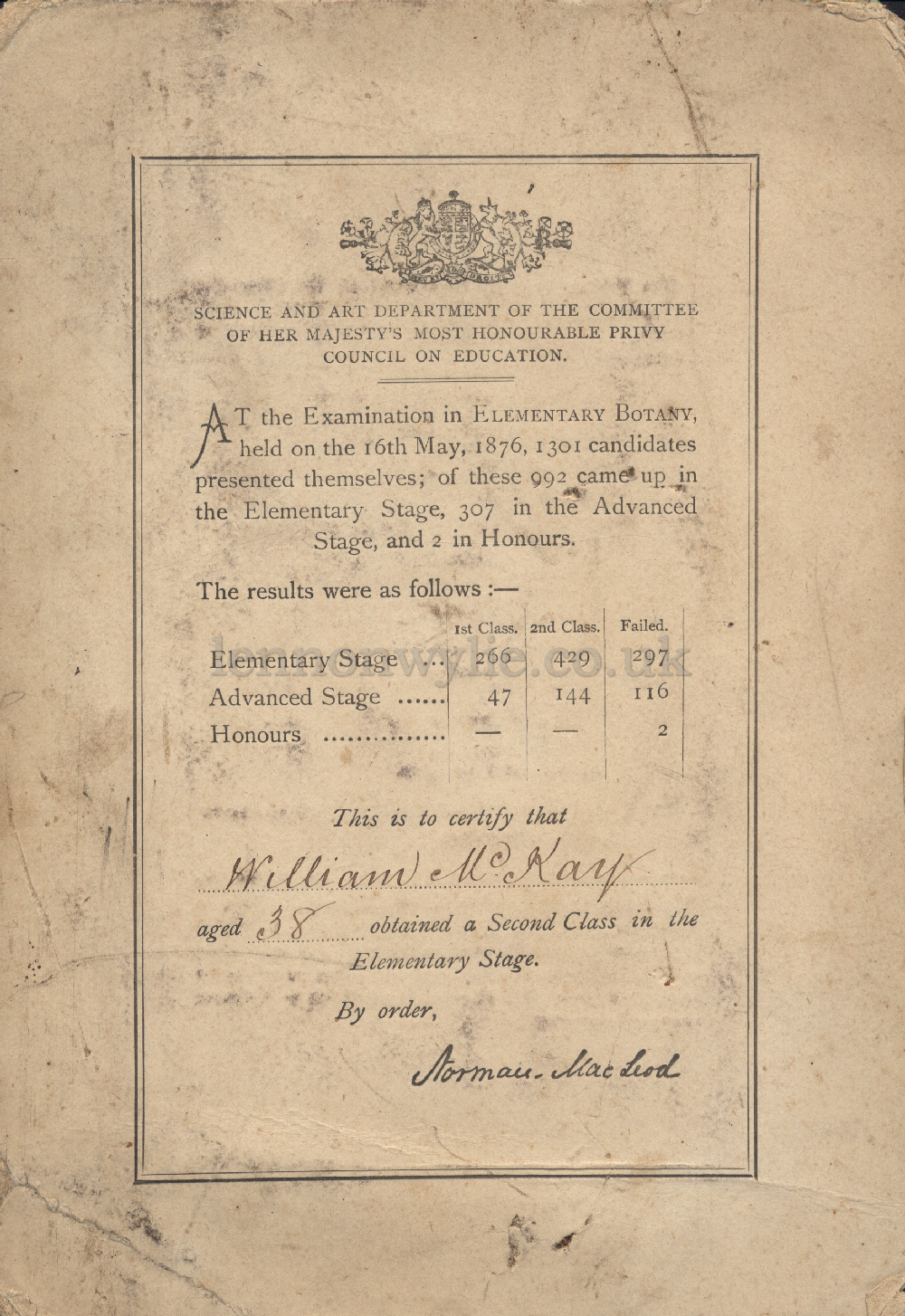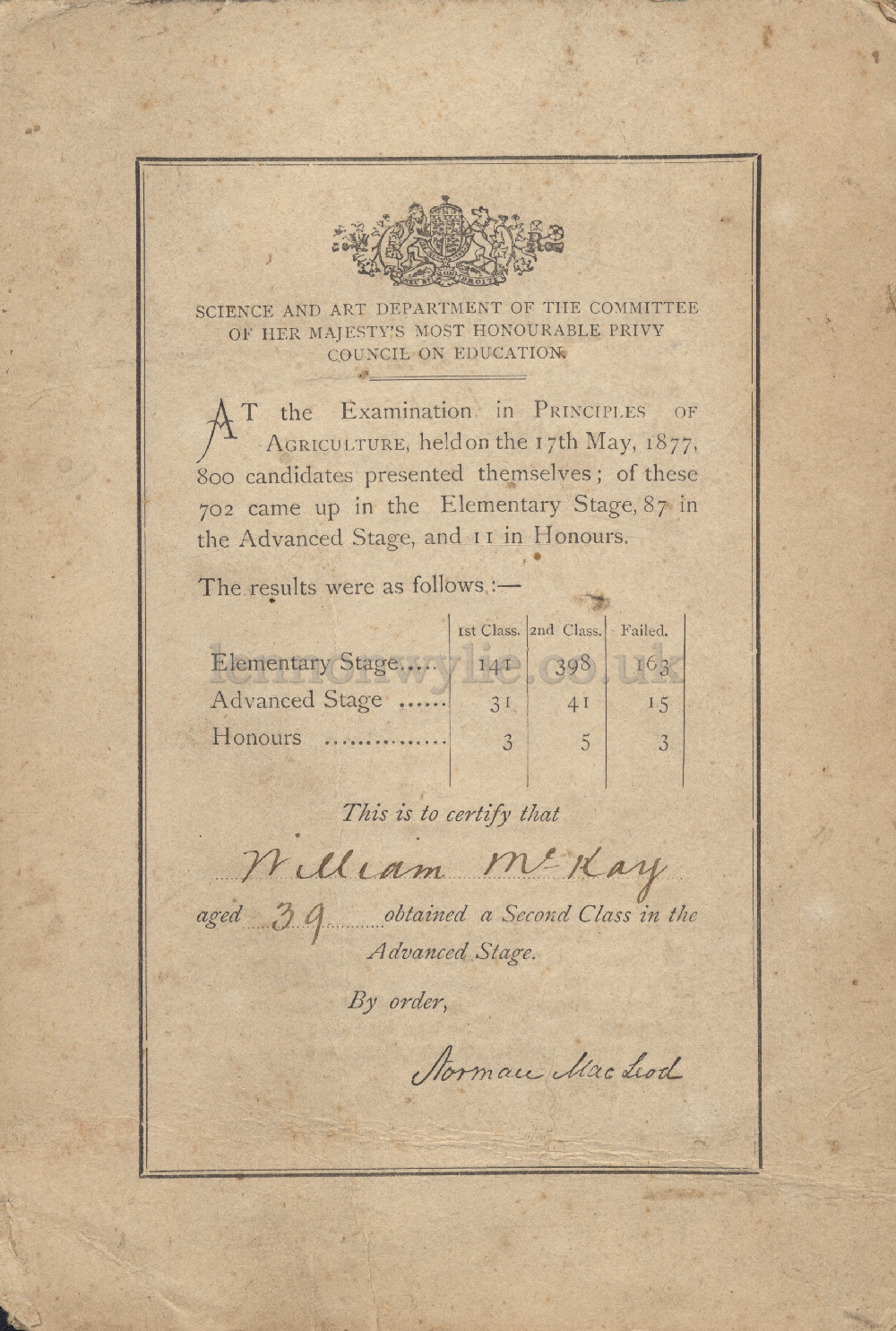William McKay aged 39 obtained a Second Class in the Advanced Stage. By