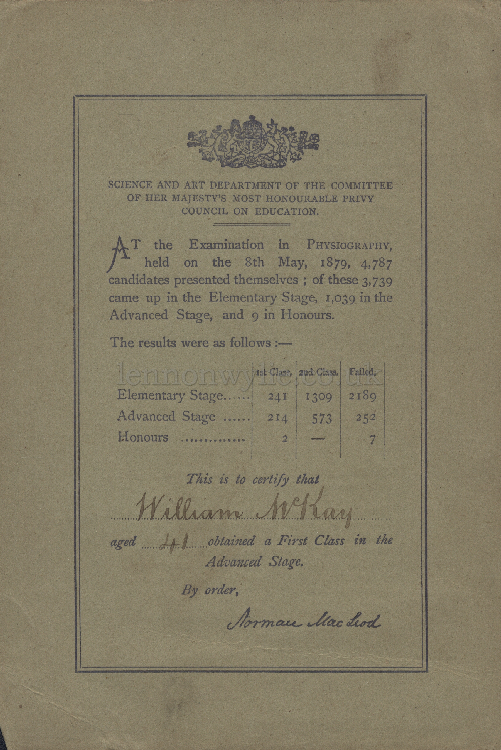 William McKay aged 38 obtained a Second Class in the Elementary Stage. By