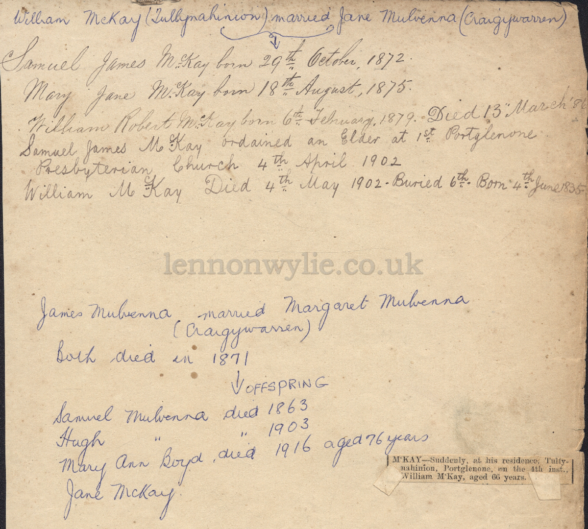 1) William McKay (Tullynahinion) married Jane Mulvenna (Craigywarren):